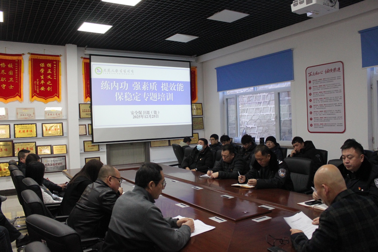 为落实省教育厅关于学校安全保卫部门经常性岗位培训要求,12月25日上午,安全保卫部(处)组织开展“练内功、强素质、提能效、保稳定”专题培训,全处人员参加培训。