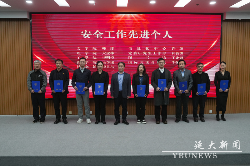 安全保卫处处长尹龙宣读《关于表彰2025年度安全工作先进集体和先进个人的决定》,10个先进集体和9个先进个人获得表彰,杜锐、孙俊奇为获奖集体和个人颁发奖牌和证书。药学院、人文社会科学学院、离退休工作处、图书馆负责人分别代表学院和职能部门向杜锐递交《延边大学2026年度安全工作暨平安校园建设目标责任书》。后勤保障处党委副书记张瑞军、理学院化学系主任太虎林先后代表先进集体和先进个人发言,结合各自开展安全工作情况作经验交流。