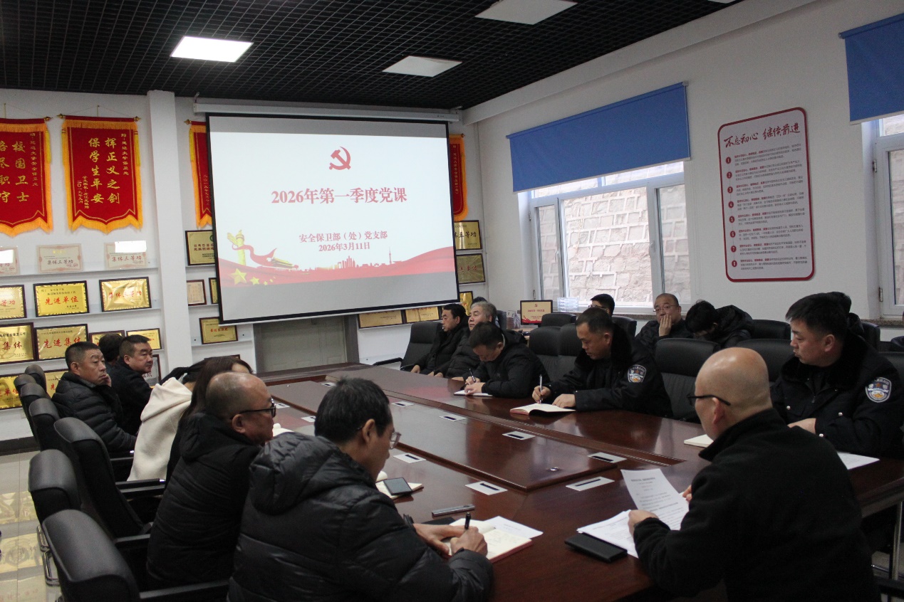 最后,尹龙处长部署春季学期安全工作和年度安全管理重点任务,并为全处党员上第一季度党课。他指出,校园安全是学校发展的基石,是师生幸福的保障。当前校园安全面临着诸多新挑战、新风险,我们必须以高度的责任感和使命感,扎实做好春季学期安全工作,稳步推进年度安全管理重点任务。他强调,2026年是“十五五”开局之年,做好校园安全工作意义重大、责任重大。我们要以2026年全国两会精神为指引,树立和践行正确政绩观,牢记初心使命,以党建引领筑牢安全防线,以严实作风守住安全底线,以精细安全服务温暖人心,全力建设平安、和谐、文明校园,为学校高质量发展保驾护航。